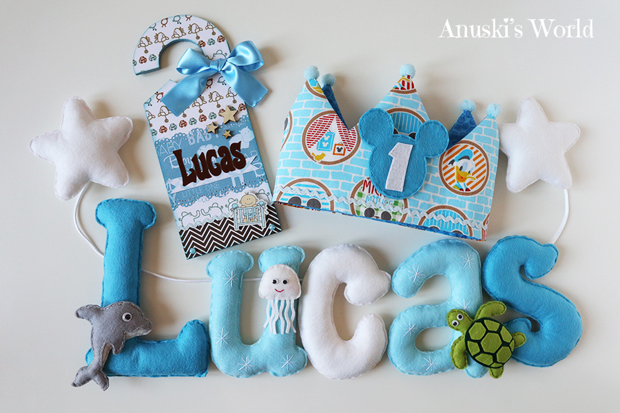 Para completar el pedido del letrero y el cuelgapuertas, la mamá de Lucas me pidió también una corona para su primer cumpleaños, con la tela de Mickey que tanto éxito tiene.