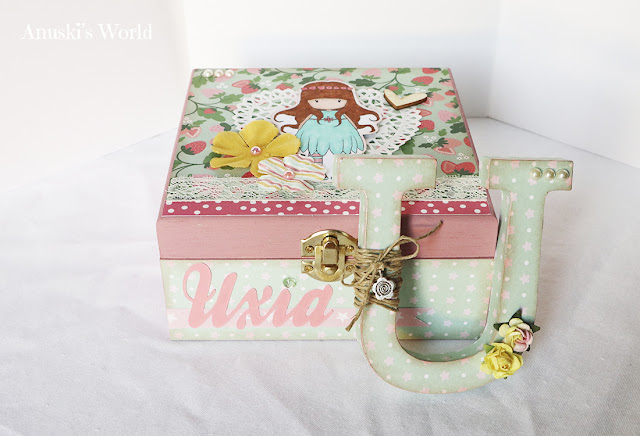 Aquí va otro joyero de comunión para Uxia, muy parecido al último que os enseñé de Sara porque me los pidió la misma persona y los quería del mismo estilo. En este caso también va acompañado de la letra de madera de su inicial decorada a juego.
